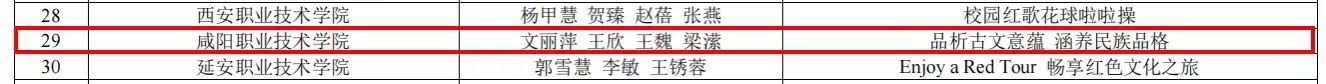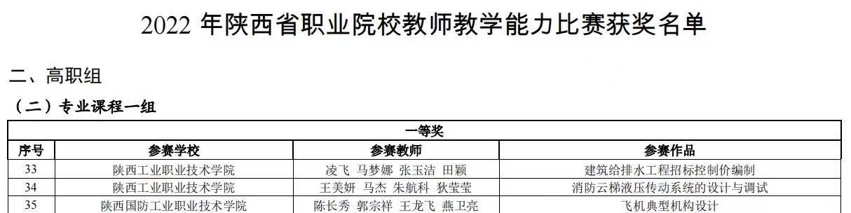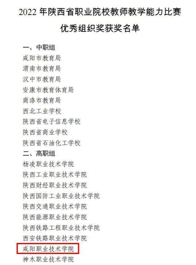 11月21日,陕西省教育厅下发《关于公布2022年陕西省职业院校教师教学能力比赛获奖名单的通知》(陕教函〔2022〕1251号),咸阳职院参赛作品荣获一等奖2项,二等奖2项,三等奖4项。学院荣获赛事优秀组织奖。