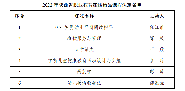 近日,从《陕西省教育厅办公室关于公布2022年陕西省职业教育在线精品课程认定结果的通知》(陕教职办〔2022〕47 号)文件获悉,我院《0-3岁婴幼儿早期阅读指导》等6门课程被认定为2022年陕西省职业教育在线精品课程。