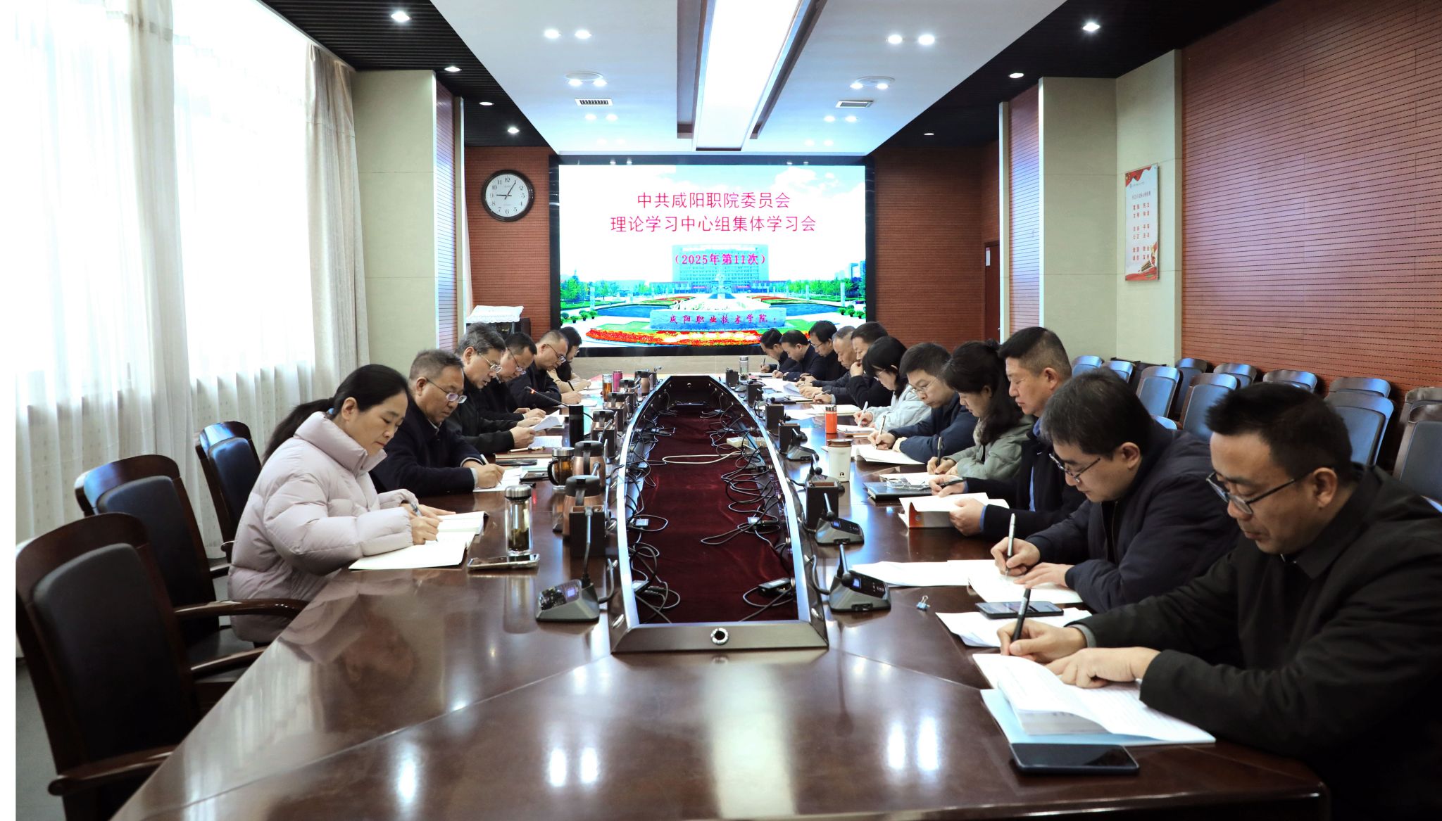 12月16日,咸阳职院党委理论学习中心组召开2025年第11次集体学习会。学院党委书记张迪,党委副书记、工会主席孙彦彬,党委副书记赵维,副院长杨新宇、吴旭锦,纪委书记王宇文和理论学习中心组全体成员参加学习。张迪主持会议。