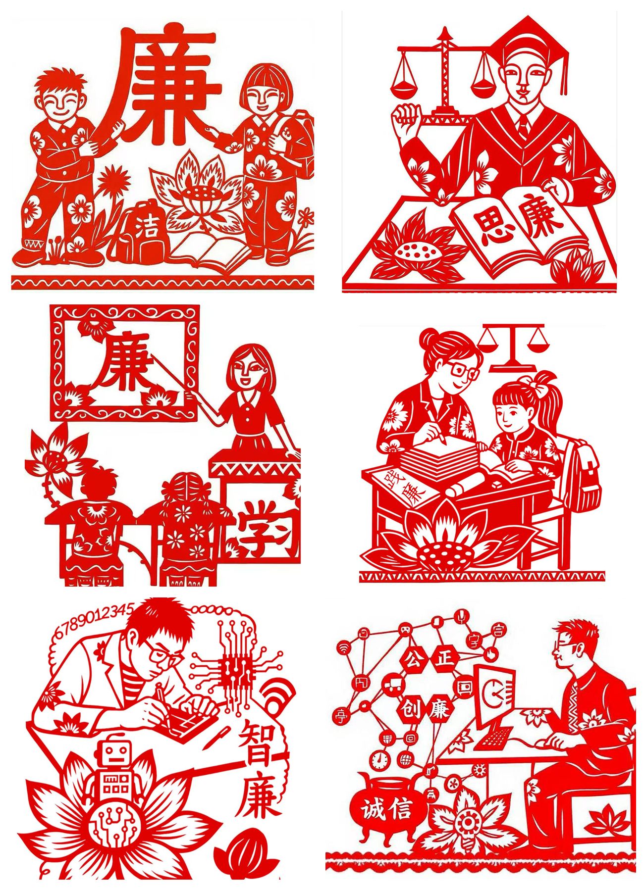 该系列作品共6幅,以传统剪纸艺术为表现形式,围绕廉洁文化主题,分别从认知启蒙、学习思考、教学传承、实践践行、科技融合、创新表达等角度切入,通过人物、场景、符号等元素的组合,呈现廉洁教育在校园日常中的不同侧面。作品在构思过程中,融入了莲花、书本、天平、课堂、科研等具象元素。其中《知廉》以儿童与书本表达廉洁启蒙,《思廉》通过学士服与“思廉”文字突出学习与思考,《学廉》《践廉》分别呈现教学与实践场景,《智廉》《创廉》将芯片、机器人、区块链符号与莲花结合,尝试以现代视角诠释廉洁内涵。