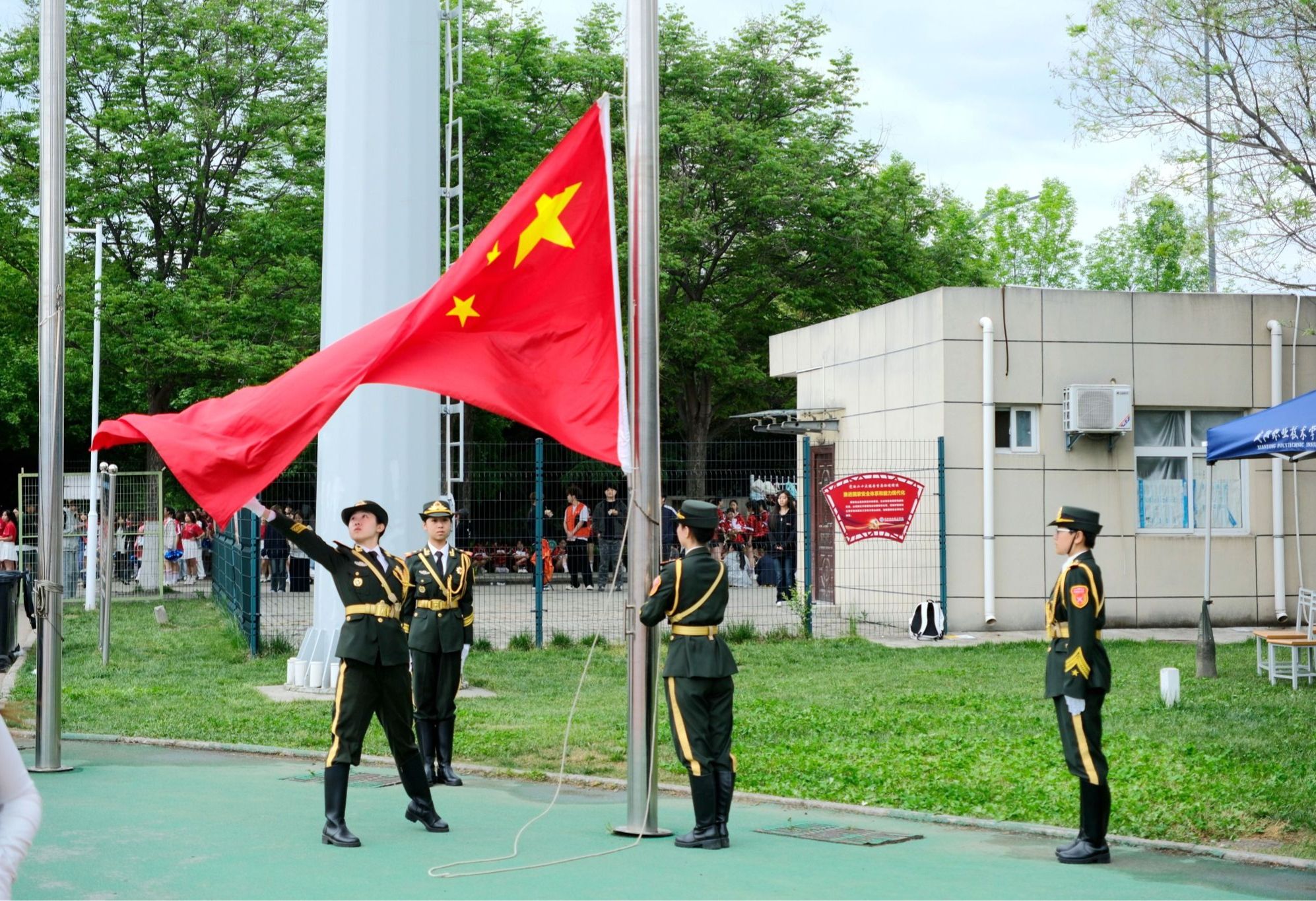 上午8:30分,伴随着激昂的运动员进行曲,裁判员与各学院代表队精神抖擞、意气风发地依次入场,整齐的步伐、嘹亮的口号展现出咸职师生昂扬向上的精神风貌。入场完毕后,全场起立,面向国旗行注目礼,雄壮的《义勇军进行曲》响彻赛场,爱国情怀与青春朝气交融激荡。