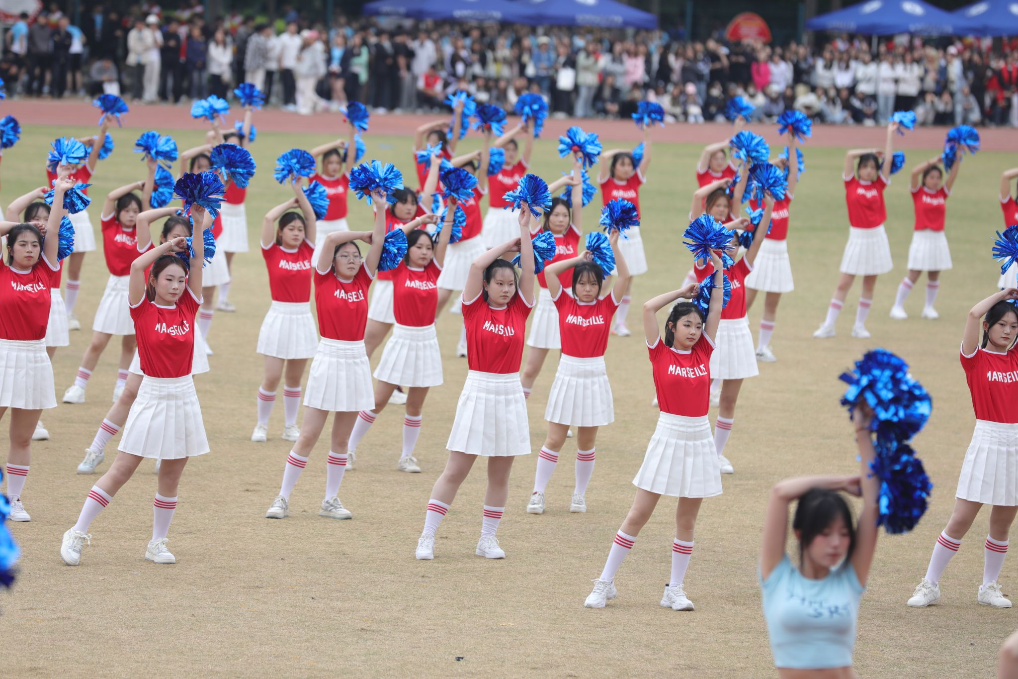 开幕式团体操表演将现场气氛推向顶峰。各学院精心编排的节目轮番登场,科技元素与传统文化的交融成为最大亮点。信息工程学院团体操表演融入了机器人和机器狗的协同演绎,科技感十足的“数字伙伴”与学子们灵动舞姿相映成趣,展现了咸职学子独有的温度与力量。机电学院团体操和着《精忠报国》的激昂旋律,传统京剧国粹与青春活力碰撞,展现中华优秀传统文化的时代风采。师范学院的“欢快小马”方阵与“奔腾骏马”方阵相映成趣,小马灵动可爱,骏马气势如虹,象征着教育事业的薪火相传与蓬勃发展。体育学院与咸阳市太极拳协会合作呈现太极扇展演,扇影灵动间尽显中华传统体育魅力,彰显校企同心、健康同行的时代风采。化工学院团体操队伍如精密仪器般井然有序,建筑工程学院啦啦操用动感舞姿诠释建筑韵律,财经学院团体操以智慧与激情的交响奏响逐梦前行的最美宣言……一个个精彩节目轮番上演,赢得现场师生阵阵喝彩。