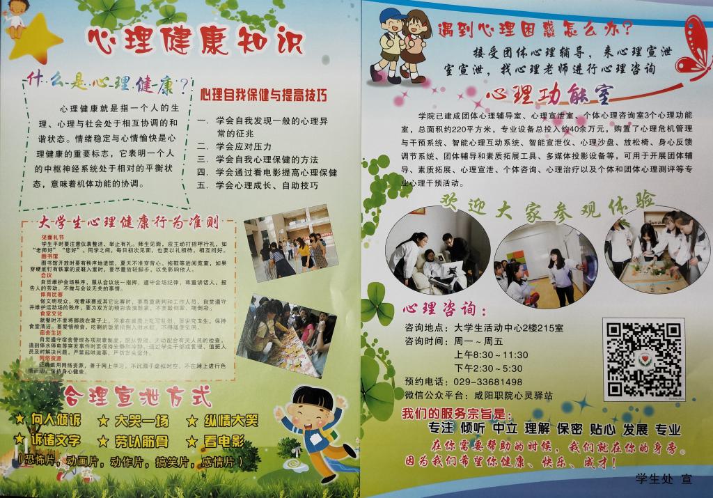 5月25日,咸阳职院开展“构建心理育人质量体系,助力学生身心全面发展”心理健康宣传主题教育活动。本次活动主要以宣传展板、发放彩页、现场签名等形式向广大学生普及心理健康知识和心理调适方法,活动覆盖全院学生,形式多样、内容丰富,共制作心理健康知识宣传展板24块,发放宣传彩页1万余份。