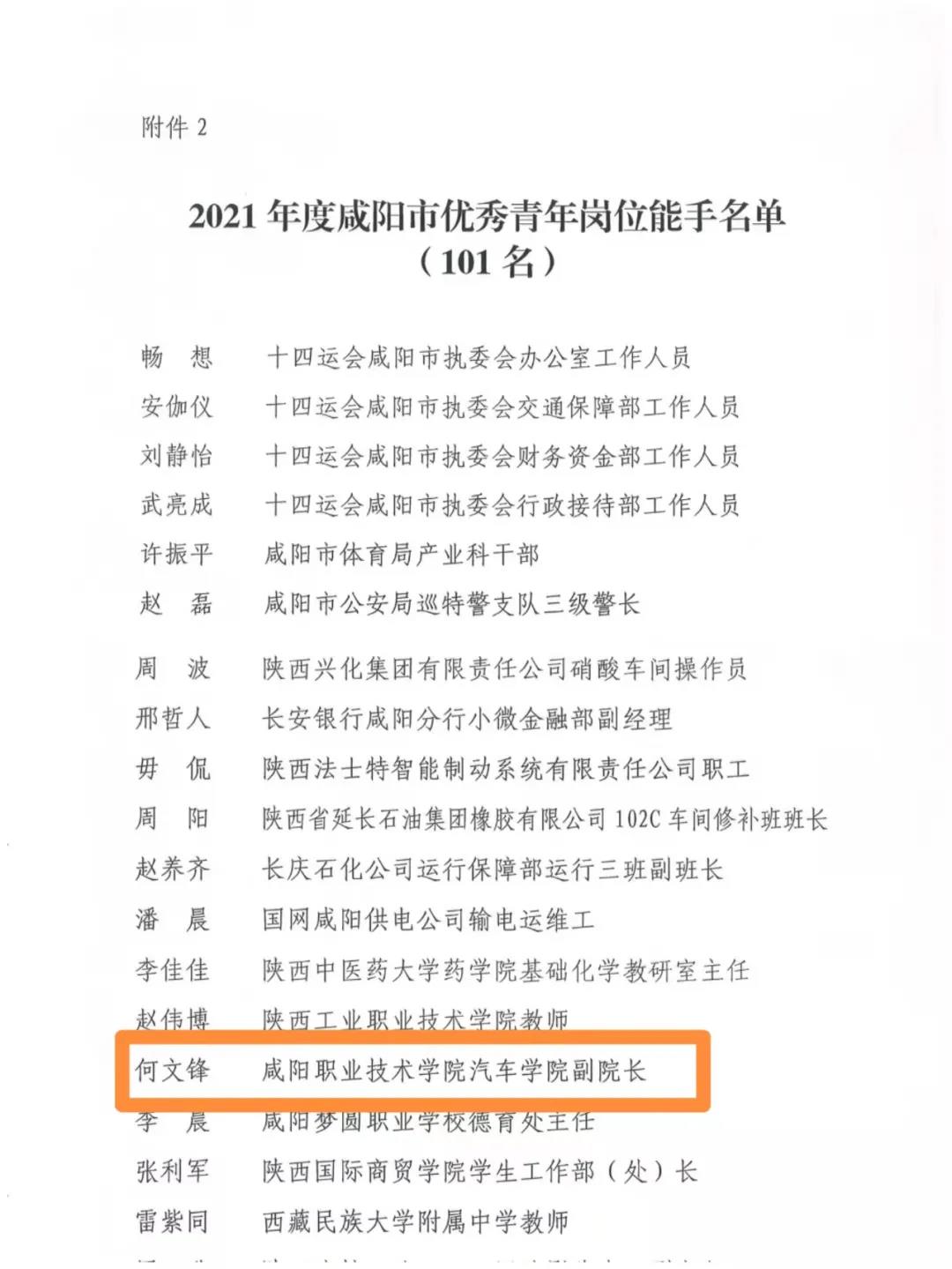 近日,共青团咸阳市委下发了《关于表彰2021年度咸阳市优秀(杰出)青年岗位能手的决定》,表彰2021年度咸阳市“优秀(杰出)岗位能手”。咸阳职院汽车学院教师何文锋荣获“优秀青年岗位能手”荣誉称号。