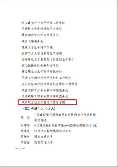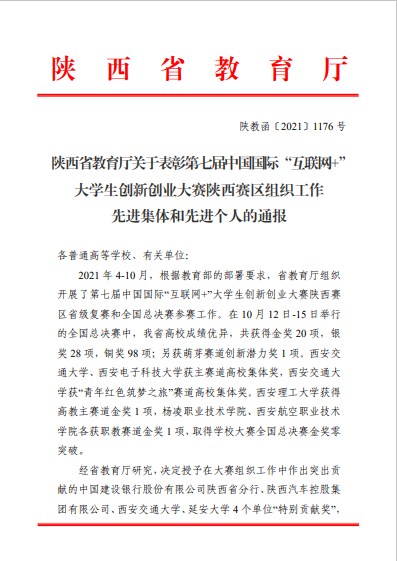 近日,陕西省教育厅发布《关于表彰第七届中国国际“互联网+”大学生创新创业大赛陕西赛区组织工作先进集体和先进个人的通报》,咸阳职院电子信息学院荣获组织工作先进集体,创新创业学院朱晨荣获组织工作先进个人。