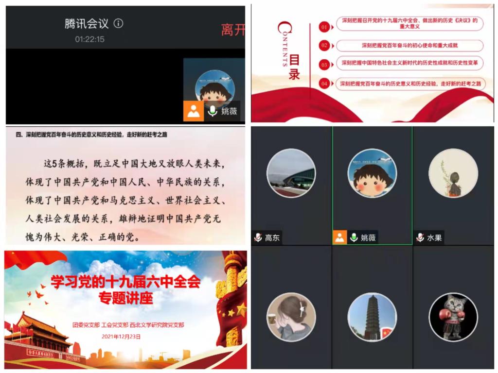 12月23日上午,学院党的十九届六中全会精神宣讲团成员、马克思主义学院教学办主任姚薇为团委党支部、工会党支部、西北文学研究院党支部全体党员作党的十九届六中全会精神线上宣讲。