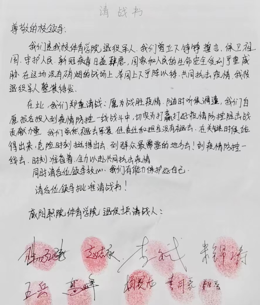 “新冠疫情日益严峻,我们作为退役军人,自愿投入到疫情防控一线战斗中”。12月25日,咸阳职院杨江涛、高峰、米锦涛、李同豪等9名体育学院在校退伍学生写下“请战书”,申请加入校内疫情防控工作。