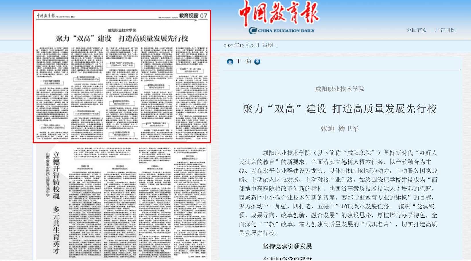 12月28日,《中国教育报》第七版教育视窗刊发我院党委书记张迪、院长杨卫军署名文章《聚力“双高”建设 打造高质量发展先行校》。文章展示了学院凝心聚力,攻坚克难,着力创建高质量发展的“咸职名片”,切实打造高质量发展先行校。现将全文转载如下: