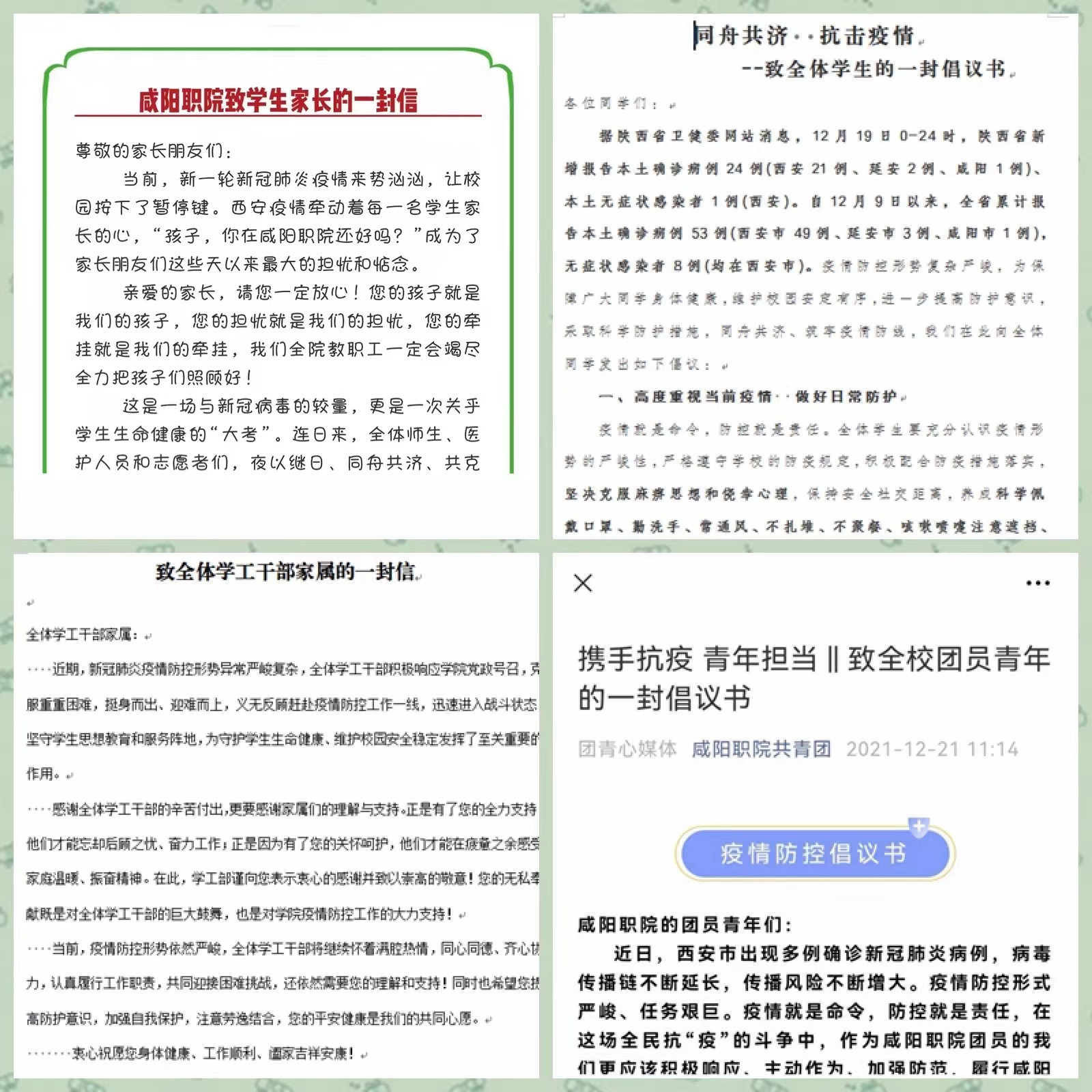 此外,学院开通线上心理咨询服务平台,开展“线上心理疏导”,确保学生身心健康。各二级学院组织开展线上疫情防控心理疏导主题教育班会,疏解封闭管理期间学生心理压力。此轮疫情发生以来,学院学生处先后发布《同舟共济抗击疫情--致全体学生的一封倡议书》《致全校团员青年的一封倡议书》《致全体学生家长的一封信》和《致全体学工干部家属的一封信》,一封封饱含深情的信件让大家感受到学院以师生为本,为师生解难的真情。