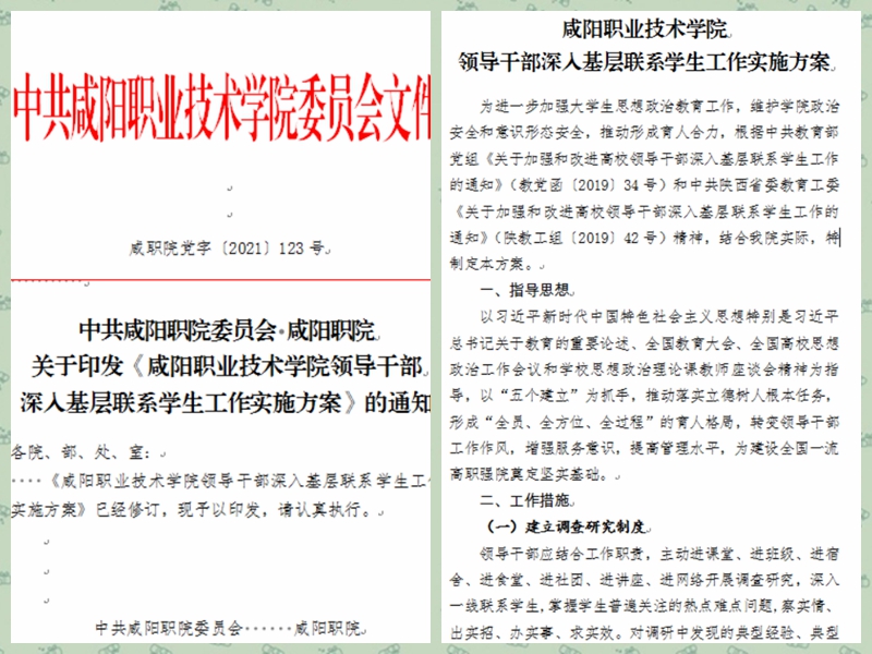 学院及时修订完善《咸阳职业技术学院领导干部深入基层联系学生工作实施方案》,进一步明确领导干部联系班级责任,推动落实“立德树人”根本任务,形成“全员、全方位、全过程”的育人格局。
